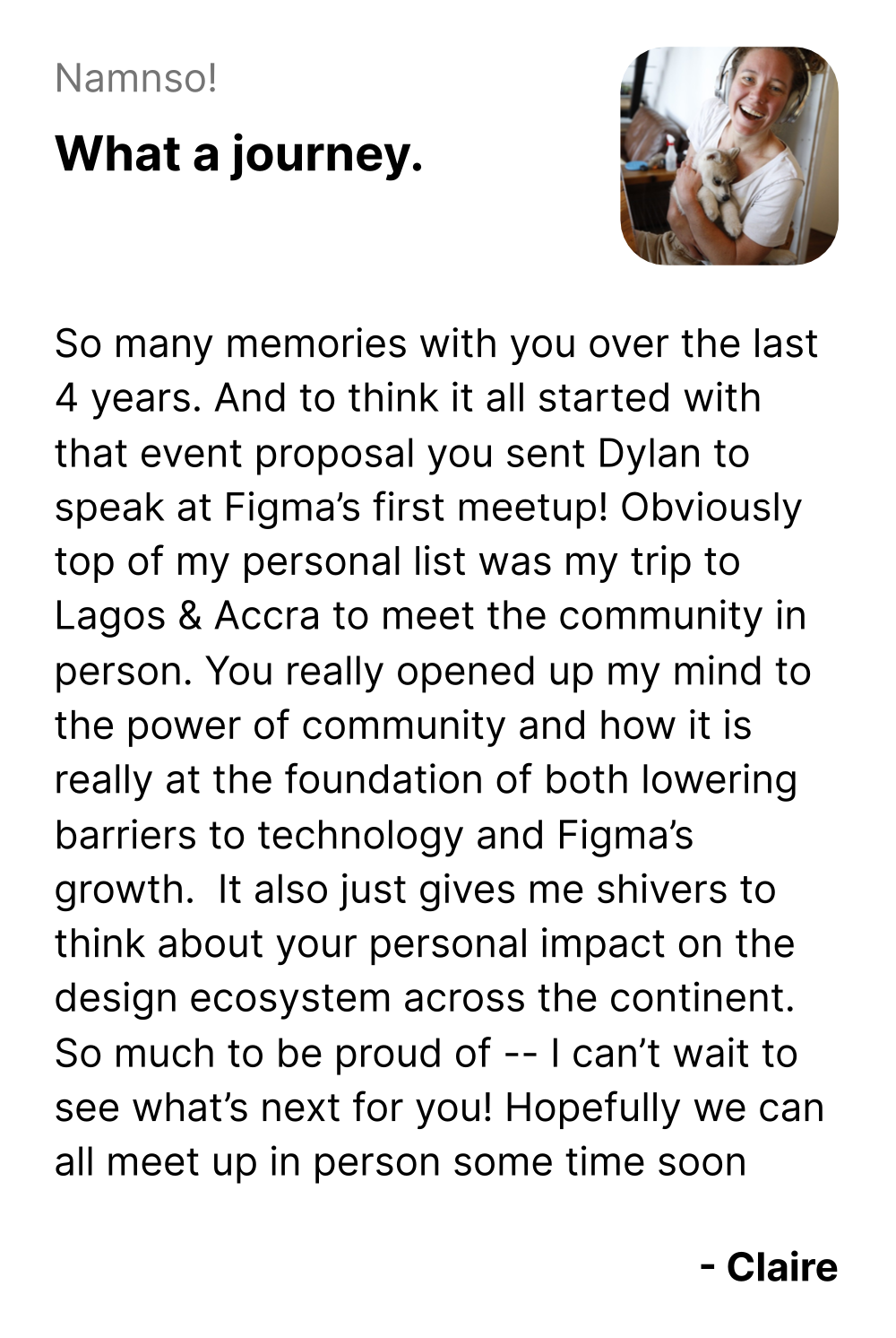 I partnered with Figma to change that. What began as a single meetup in Lagos, Nigeria became Friends of Figma Africa with groups across 26 cities in 11 countries, driving continuous learning, mentorship, and career advancement opportunities.